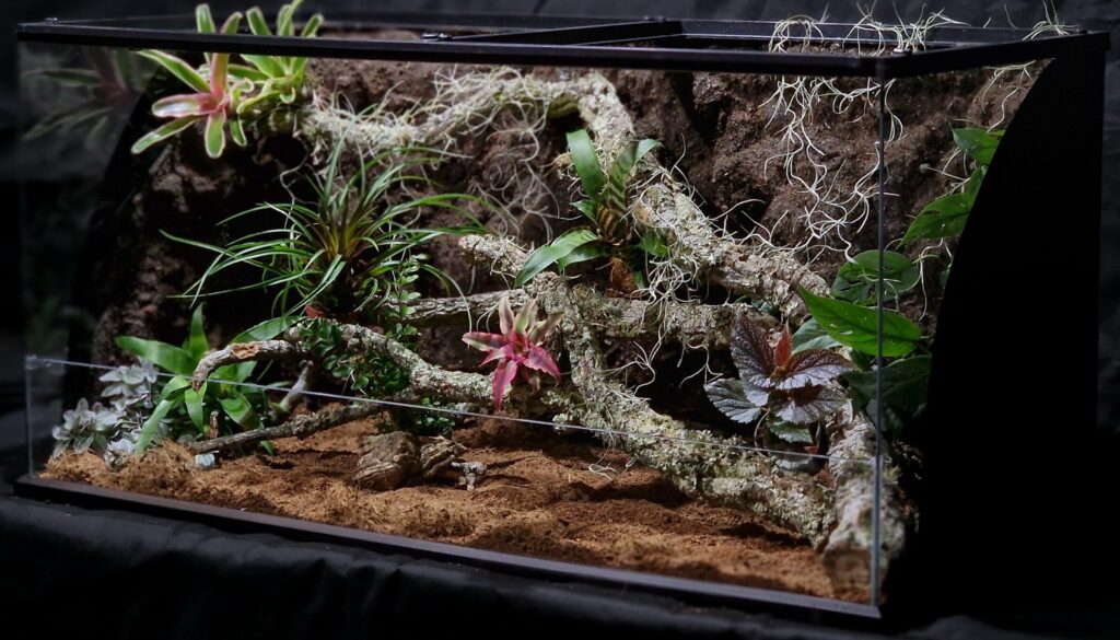 Przykładowa aranżacja terrarium dla pytona królewskiego inspirowana środowiskiem leśnym.